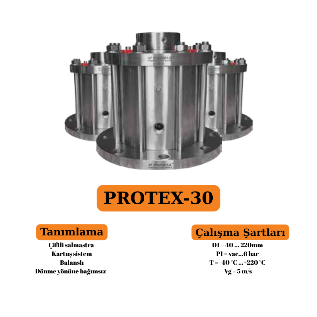 Protex 30 ;üstten tahrikli ekipmanlar için tasarlanmış çift salmastra çözümleri sunar. Balanssız yapısı ve dönme yönüne bağımsız özellikleri ile güvenilir sızdırmazlık sağlar. Sıvı yağlama ve kartuş ünitesi sayesinde, montaj kolaylığı ve uzun ömürlü kullanım sunar. Petrokimya, kimya, ilaç, gıda ve içecek endüstrilerinde sıklıkla tercih edilen bu modeller, yüksek verimlilik, düşük işletme maliyeti ve mükemmel sızdırmazlık performansı ile endüstriyel ekipmanlarınızda güvenli ve etkili çözümler sağlar.